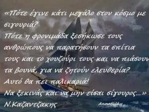 Και σεις αδέρφια μου, φοβάστε? Τι? Δυο χέρια και δυο πόδια έχουμε, θα χτίσουμε την Ελλάδα από την αρχή. Γερές οι πλάτες μας, τα μπράτσα μας στιβαρά. Εδώ θα μείνουμε θα κρατήσουμε τη γραμμή που μας έχει οριστεί από τη μοίρα μας. Εδώ, αυτή την ύστατη στιγμή που η ιστορία μας καλεί, θα πάρουμε τη θέση μας μπροστά στη φάλαγγα και θα αντιμετωπίσουμε αγέρωχοι το μέλλον. Όποιο και αν είναι αυτό.