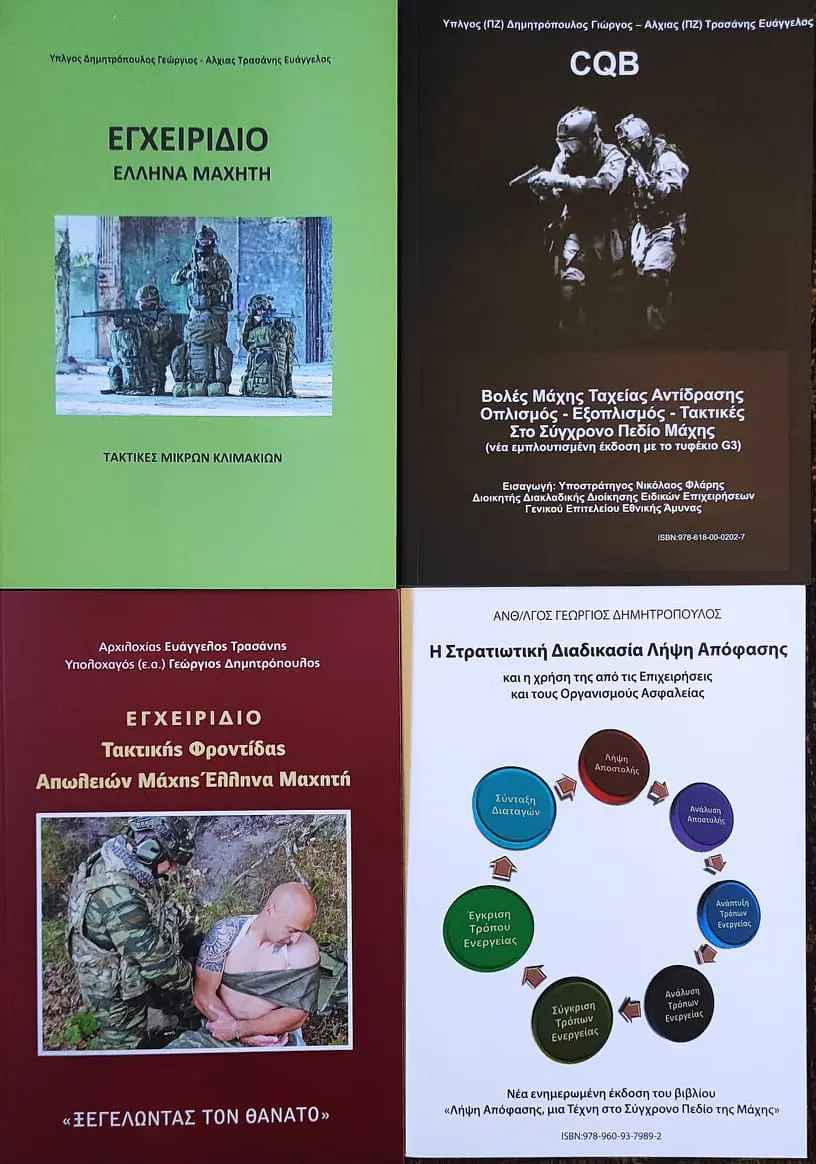 – «CQB: Βολές Μάχης Ταχείας Αντίδρασης, Οπλισμός, Εξοπλισμός, Τακτικές», το οποίο είναι μια πραγματική ….Βίβλος, καθώς περιέχει σχεδόν τα πάντα όσον αφορά τακτικές συμπλοκής με φορητό οπλισμό σε κάθε είδους περιβάλλον και κατάσταση για κάθε μαχητή των Ενόπλων Δυνάμεων (εν ενεργεία, έφεδρου ή εθνοφύλακα), των Σωμάτων Ασφαλείας και των οργανισμών ιδιωτικής ασφάλειας, σχετικά με την χρήση οπλισμού, την επιλογή εξοπλισμού και τις νέες τακτικές στο σύγχρονο και απαιτητικό πεδίο μάχης. Από τις βασικές αρχές της σκόπευσης και τις θέσεις βάλλοντος, μέχρι πολύπλοκες τακτικές εκκαθάρισης οικίας, μάχης σε κλίμακες, νηοψίες σε πλοία, ελέγχους σε οχήματα, τεχνικές στρατιωτικής διάρρηξης, και πολλά άλλα. Όλα τα αντικείμενα καλύπτονται συστηματικά βήμα προς βήμα με την βοήθεια 500 φωτογραφιών και 300 σχεδιαγραμμάτων. Η δεύτερη έκδοση του βιβλίου περιλαμβάνει και το τυφέκιο G3.